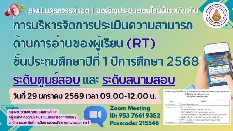 สพป.นครสวรรค์ เขต ๑ การประชุมออนไลน์ชี้แจงเกี่ยวกับการบริหารจัดการประเมินการอ่านของผู้เรียน (RT) ชั้นประถมศึกษาปีที่ ๑ ปีการศึกษา ๒๕๖๘ ระดับศูนย์สอบ และระดับสนามสอบ ของสำนักงานเขตพื้นที่การศึกษาประถมศึกษานครสวรรค์ เขต ๑