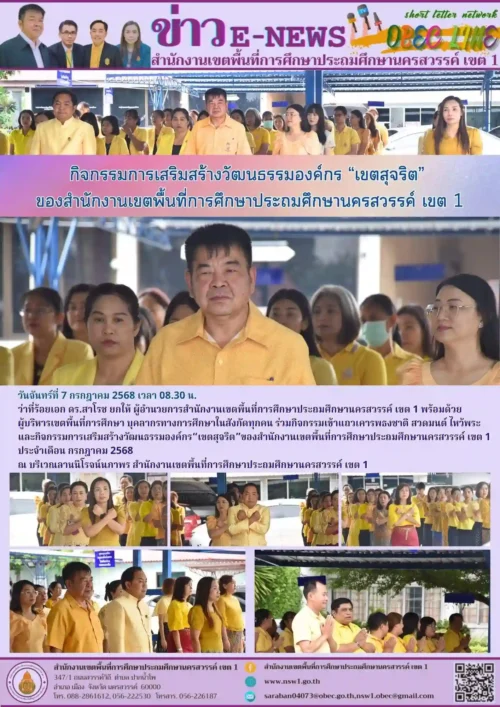 สพป.นครสวรรค์ เขต 1 จัดกิจกรรมการเสริมสร้างวัฒนธรรมองค์กร “เขตสุจริต” ของสำนักงานเขตพื้นที่การศึกษาประถมศึกษานครสวรรค์ เขต 1 07/07/202514/08/2025 Post Views 187 FacebookFacebookXXLINELine